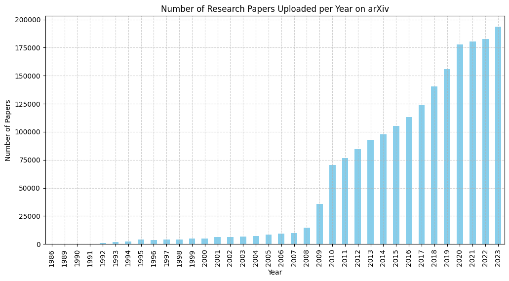 Looking at Figure 1, it’s clear that the annual number of research papers uploaded to arXiv from its inception through to 2023 is increasing precipitously.